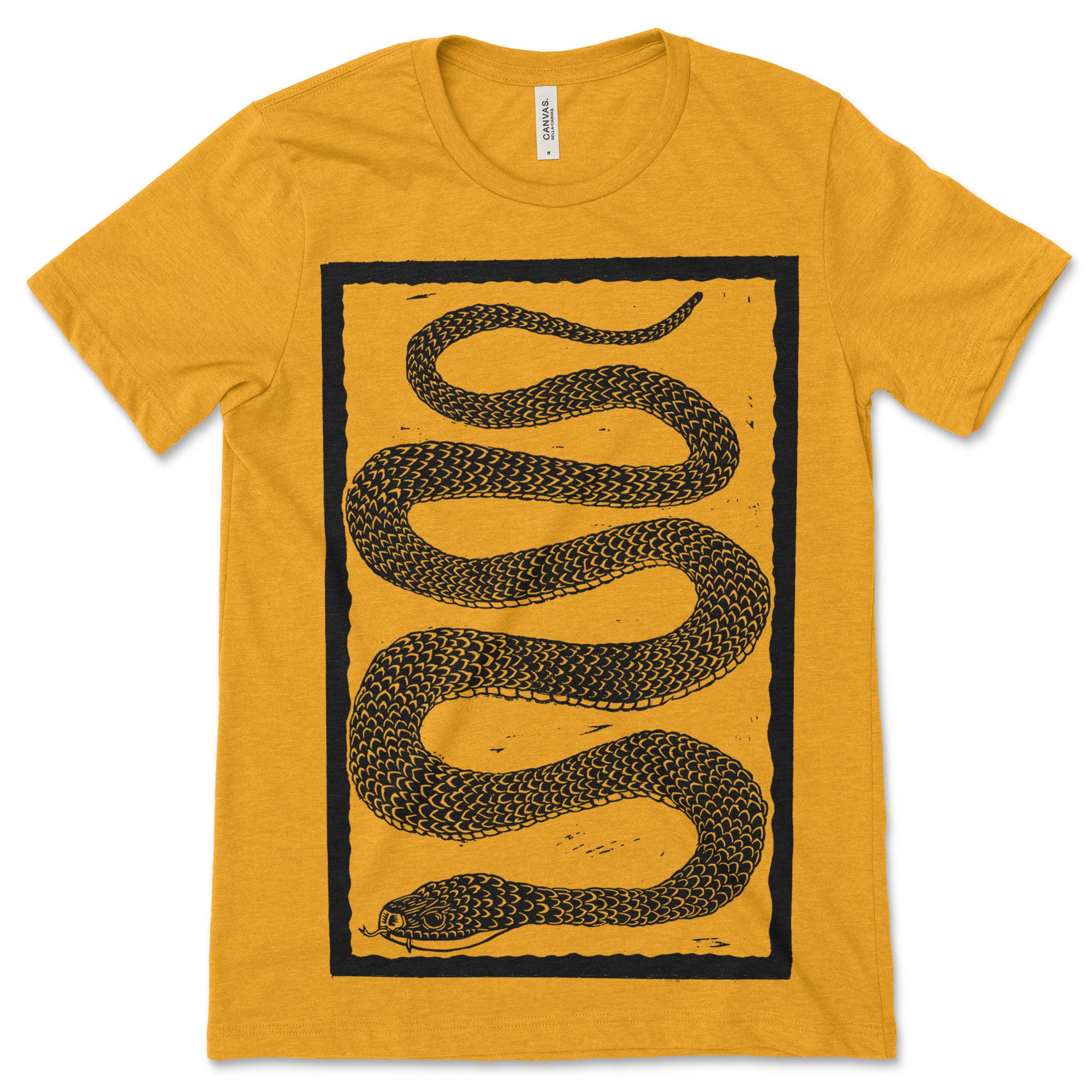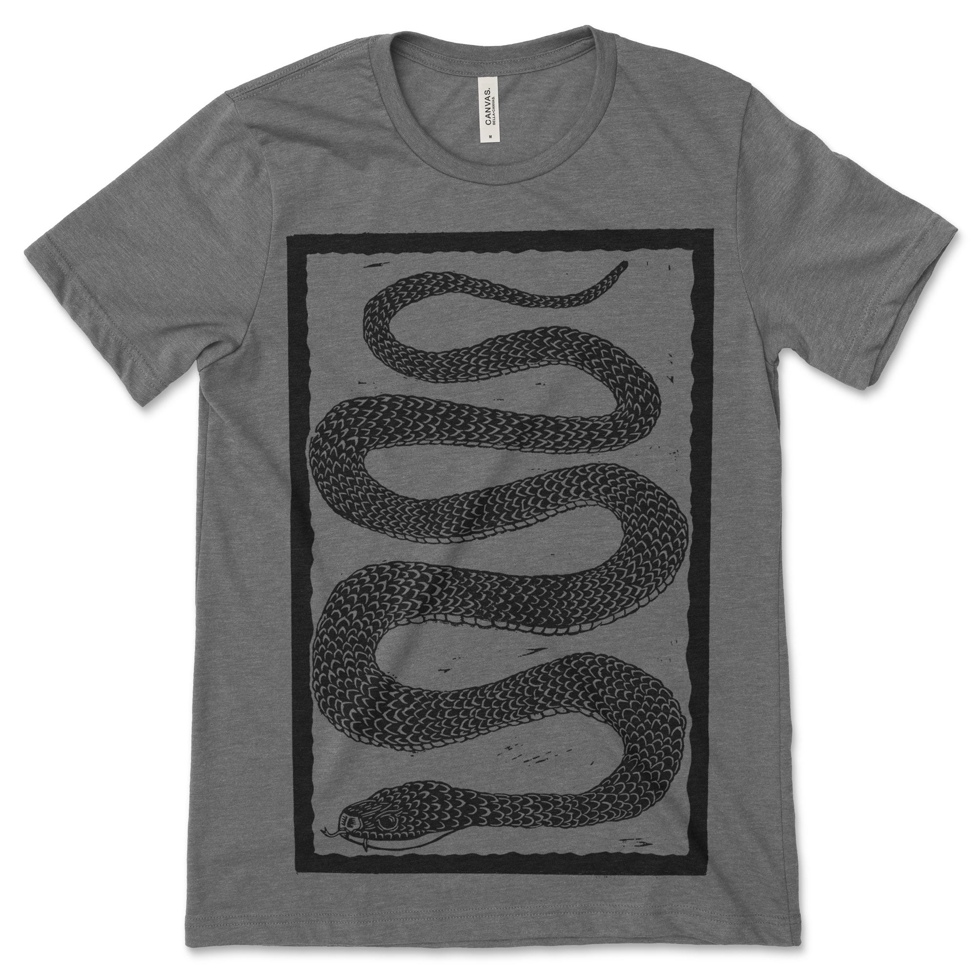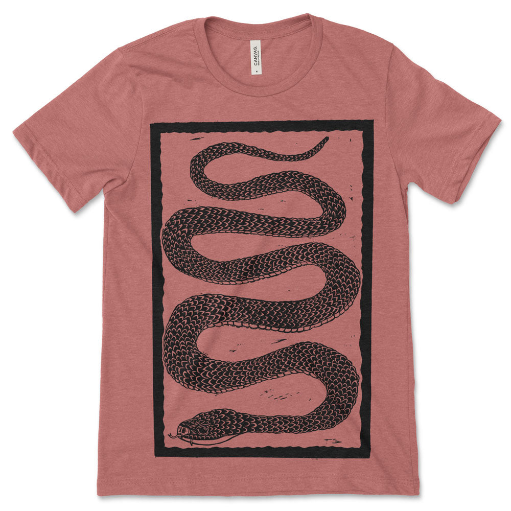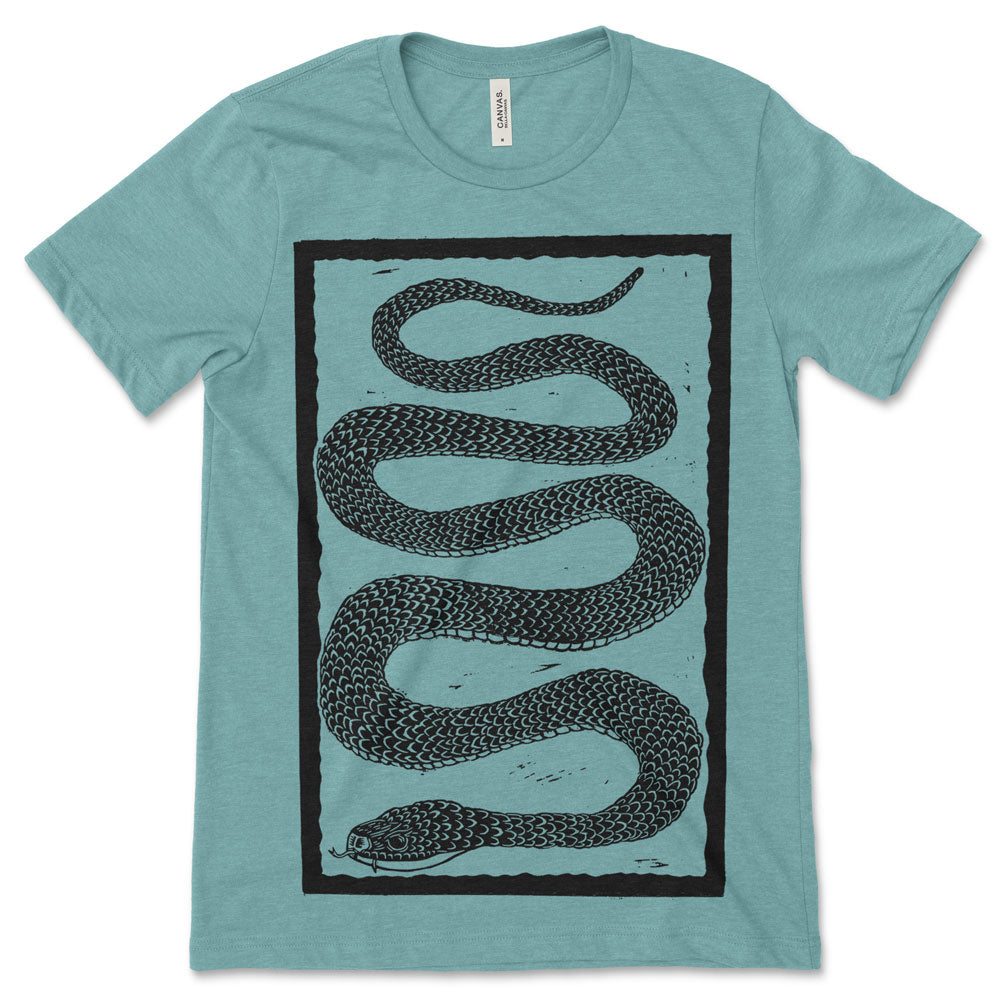 Sssssssssssss. The Sneaky Lil' Snake Tee is a woodcut design made to celebrate the beauty of one of natures most infamous critters. This fun shirt is perfect for the person who prefers reptiles over the furry or feathered animals.